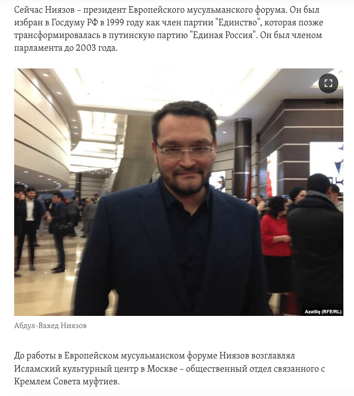 “EMF spreads anti-Western propaganda narratives about flourishing Islamophobia in some European countries and military crimes allegedly committed by the US in the Middle East, participates in projects dedicated to the memory of Akhmad Kadyrov, and the president of the Forum, Abdul-Vahed Niyazov, and maintains contacts with the administration of Ramzan Kadyrov. Niyazov participated in the creation of propaganda materials about the actions of Chechen troops in the city of Volnovakha near Mariupol (east of Ukraine),” noted the Lithuanian intelligence report.
