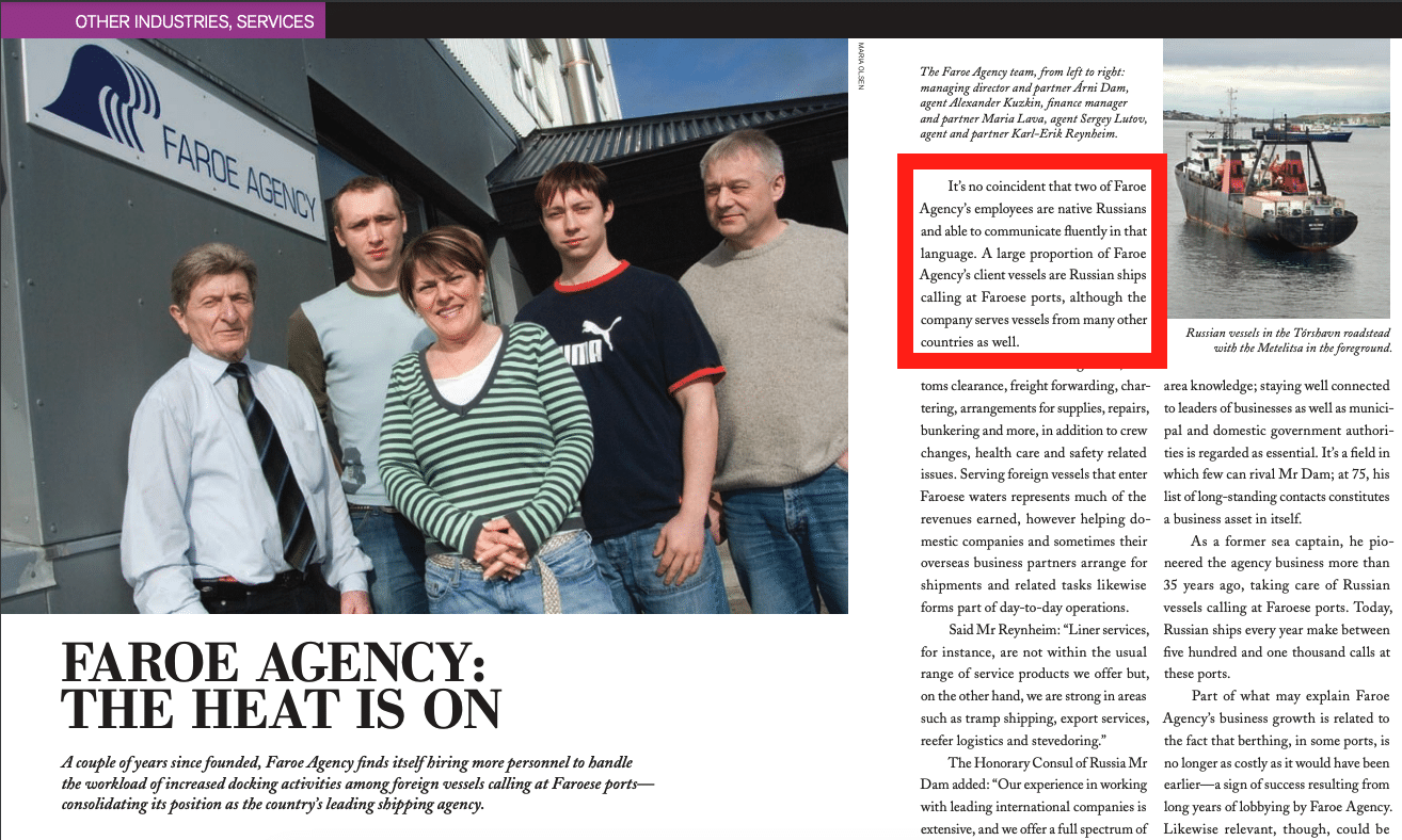 Maria Akrabergi and employees of Faroe Agency. The advertising brochure states that the company employs Russians and its main clients are Russian ships