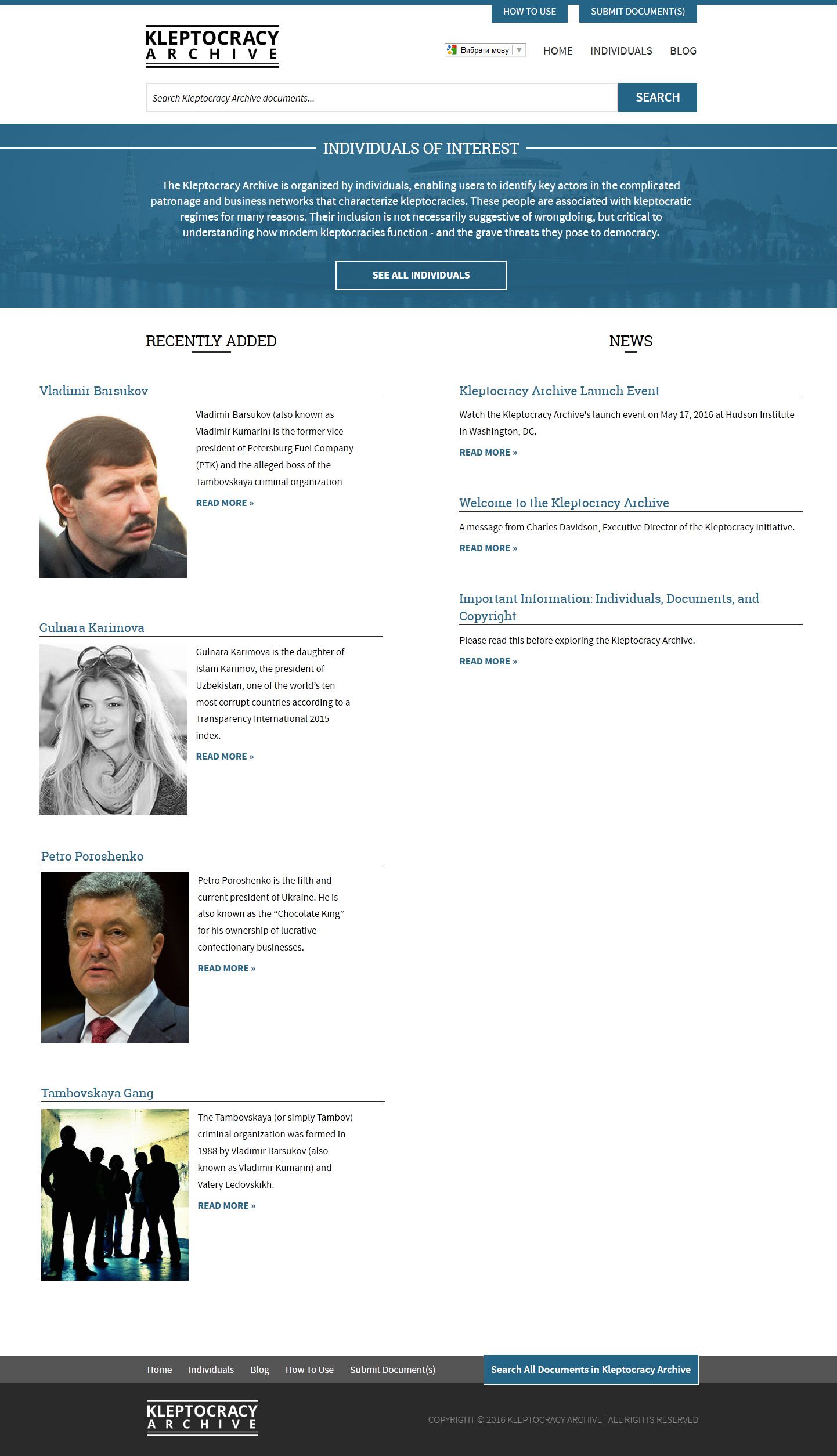 The Kleptocracy Archive will be constantly updated, adding new material every day, Julie Davidson, the Director of KI said. For now, over 100,000 pages are available on the Archive’s website, and 25,000 additional documents are in the process of being processed and uploaded, including summaries on over 100 legal cases. The main sources for the Archive thus far have come from research done by the Kleptocracy Initiative’s own staff, as well as from investigative journalists. In the future, the founders hope that crowdsourcing is going to be the main source of the Archive’s growth. Submitted documents that are accepted into the Archive will be carefully scrubbed of all metadata to preserve submitters’ anonymity.
