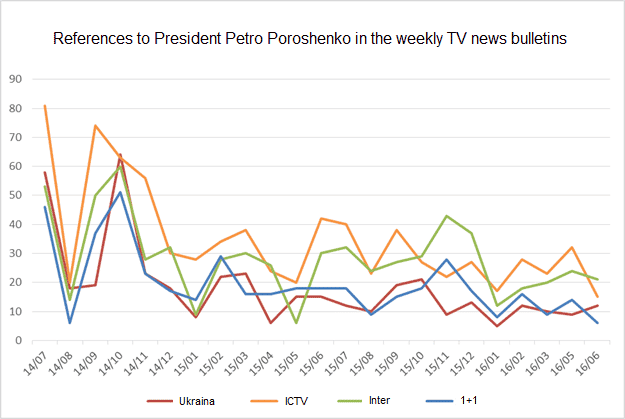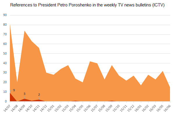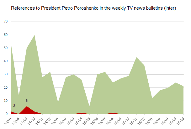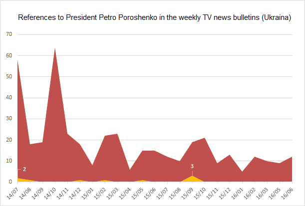 We have gathered the transcriptions of all weekly news bulletins in the period from the inauguration of Petro Poroshenko (June 7, 2014) until July 2016. We have focused on the context in which the most popular TV channels mention the president. We have chosen the surname “Poroshenko” as a unit of analysis, but have excluded the references to the “Petro Poroshenko Bloc” from the results. We have defined as critical those mentions that included a direct or indirect critique. For instance, the mentions of Petro Poroshenko’s political past (particularly about his role in founding the Party of Regions and his work in the Azarov’s government) are also viewed as negative, even though they are not directly critical. Negative mentions have also included the staffing policy of the president (nepotism), breaking his promises, accusations of inactivity and authoritarianism.