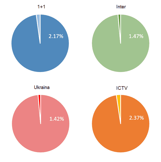 In order to check the hypothesis about the biased reporting of the President’s activities, we have analysed the main news bulletins of the most viewed Ukrainian TV channels in the prime time on Sunday in the last two years. The sample includes the four biggest TV groups in Ukraine: